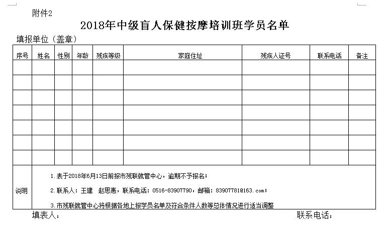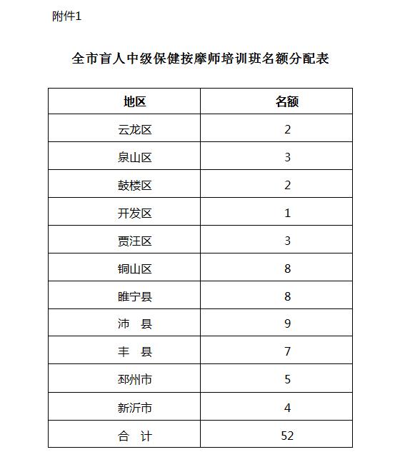 附件:1、徐州市盲人中级保健按摩师培训班名额分配表